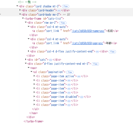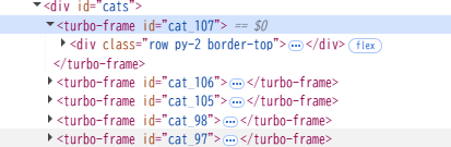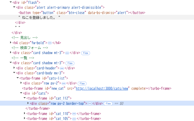 flashタグの内容が変化していること、catのturbo-frameタグが増えていることが分かります。